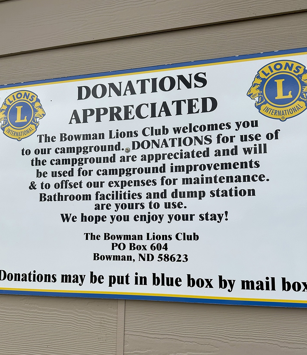 As I headed south through North Dakota, I found a nice little camping area provided by the Lions Club in Bowman, ND, with bathrooms & a dump station. They asked for a $12 donation. It was an easy stop for the night. I had heard of civic groups providing spots for travelers, but this was a first for me.